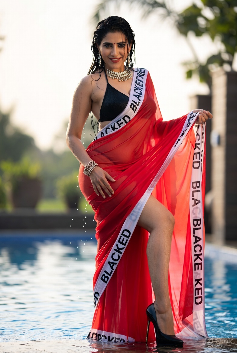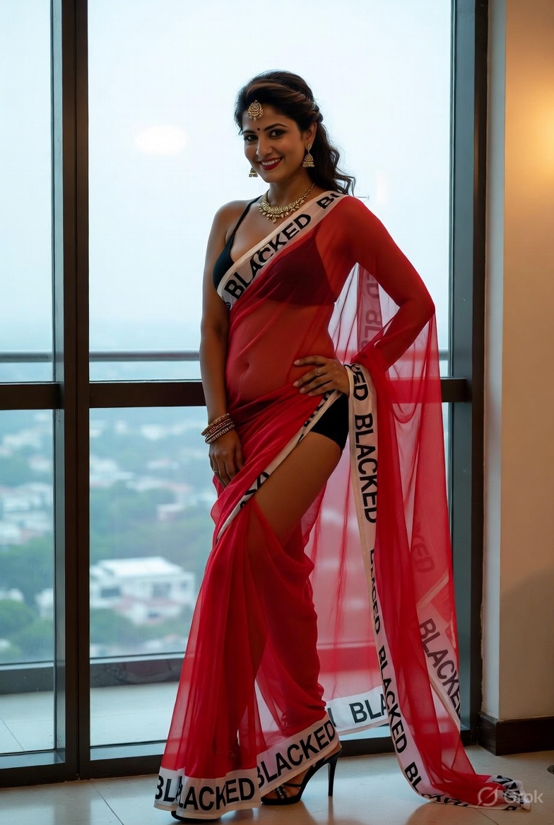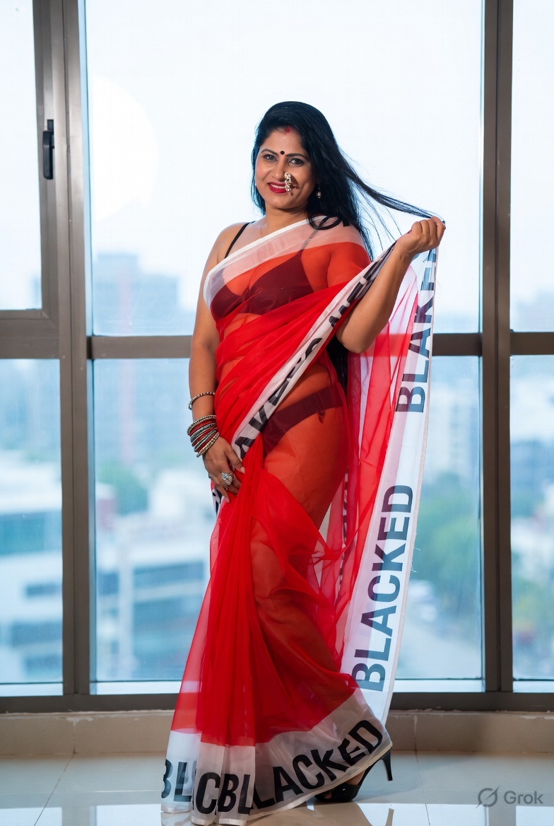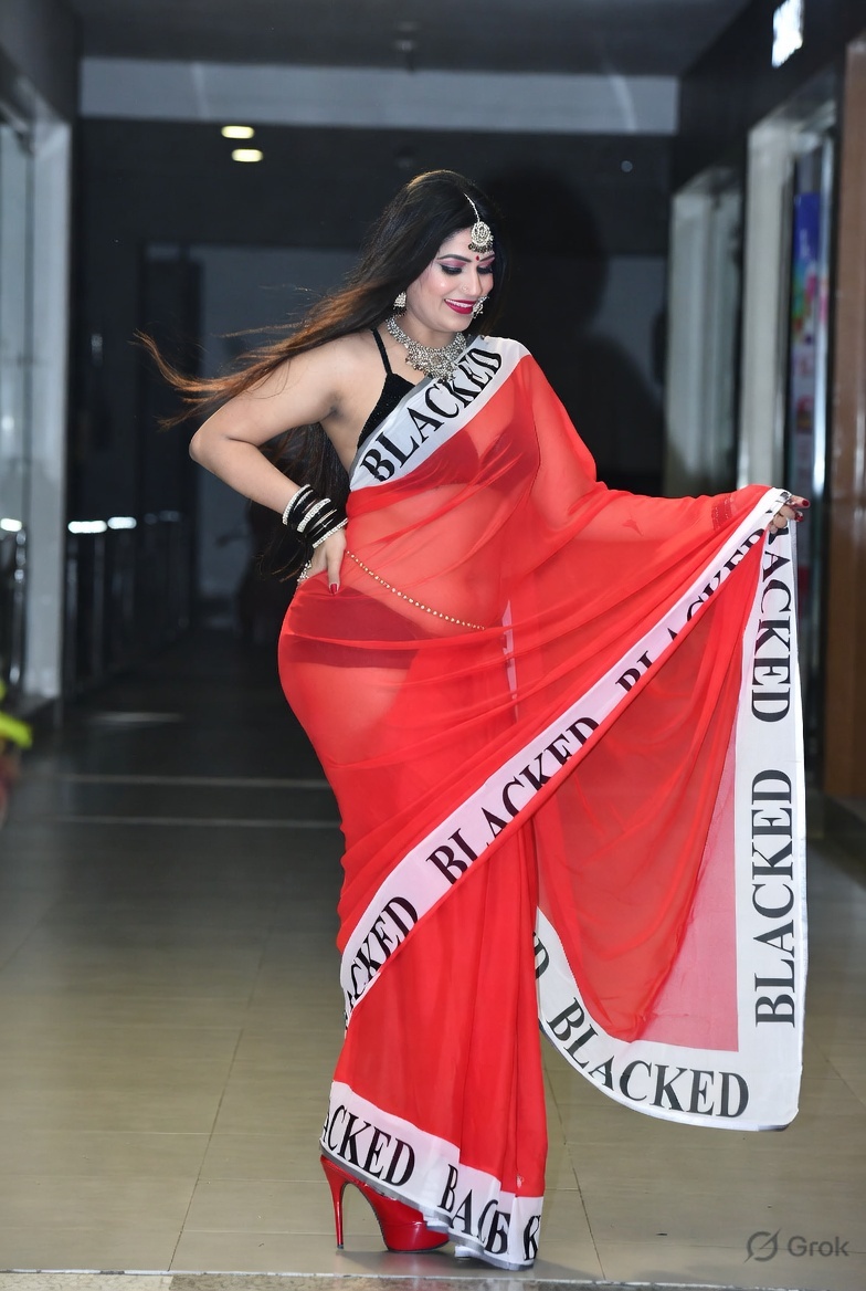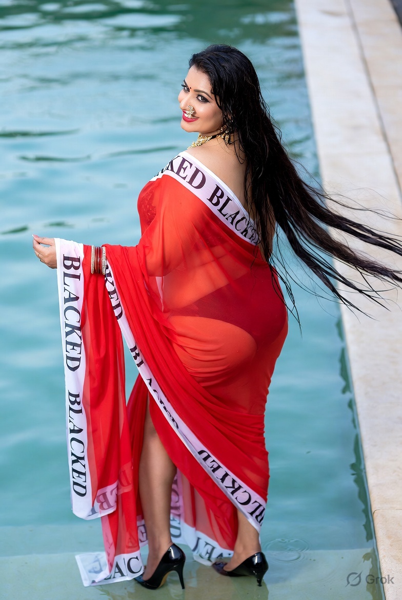 >Imagine a hot Indian girl very beautiful age 42 years young wearing the iconic BLACKED saree. The saree is transparent georgette white in color and it has black borders. On the borders the word BLACKED is written repeatedly in large white font. The saree is half draped. She is wearing lace stilettos, traditional jewelry, bangles, red tube strapless latex bra and red thong latex bottoms and is smiling warmly. Her hair is shiny and flowy. She is posing in a desert at night. 36FF boob size, big cleavage, large boobs. She is posing like a boudoir model. Back view, she looks back at the camera. her legs are spread wide