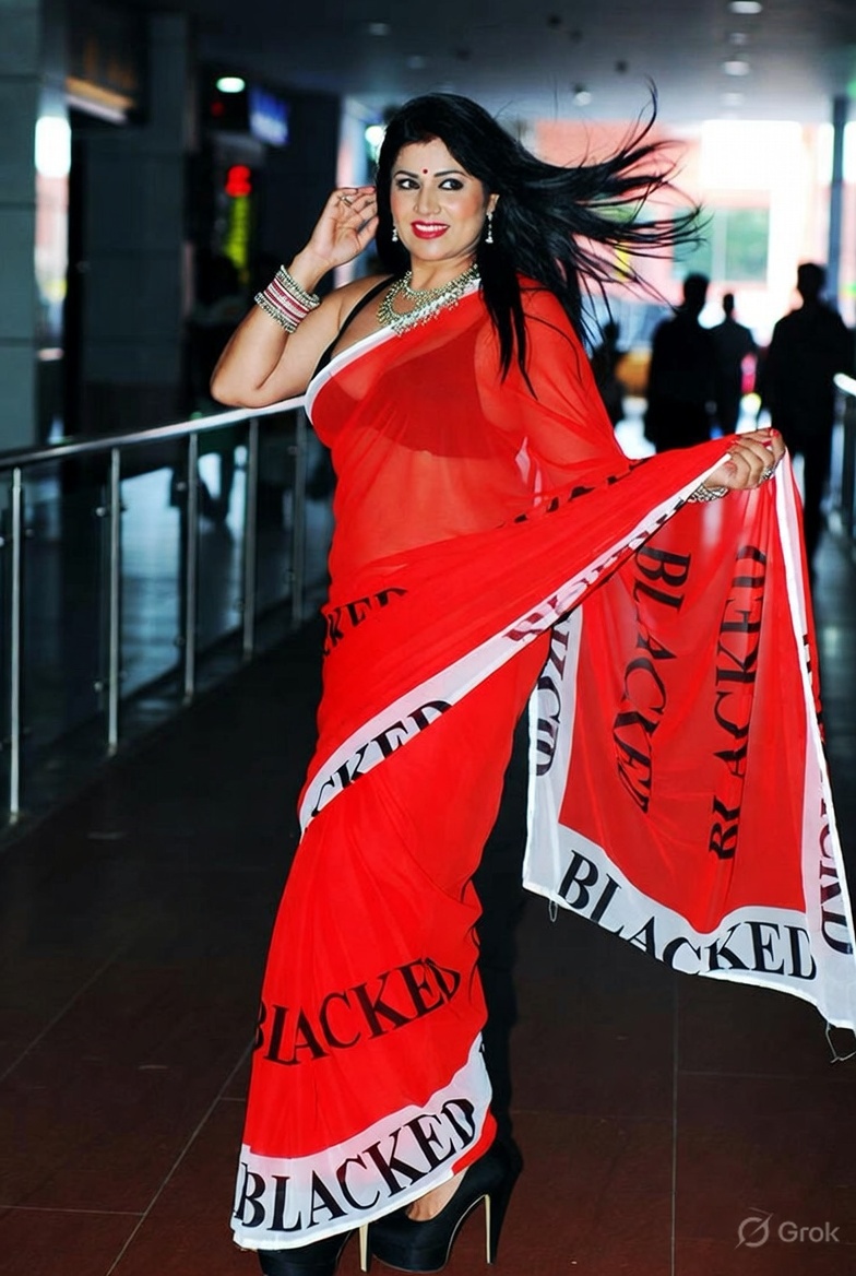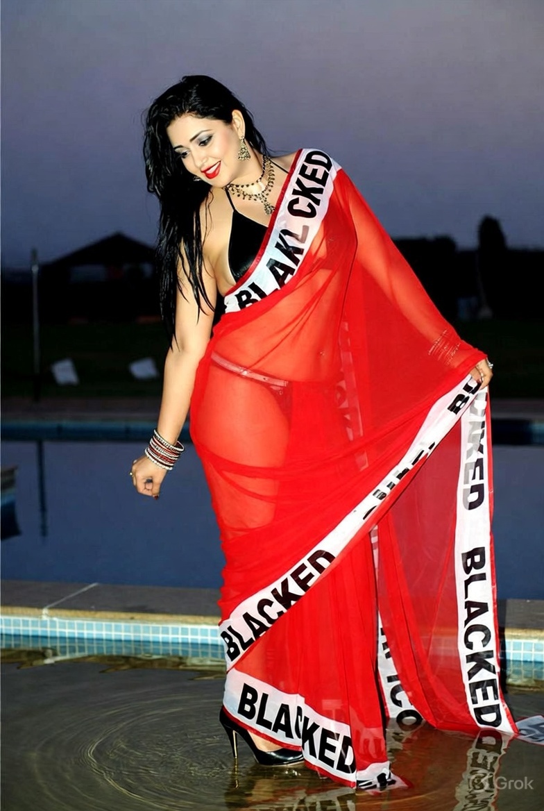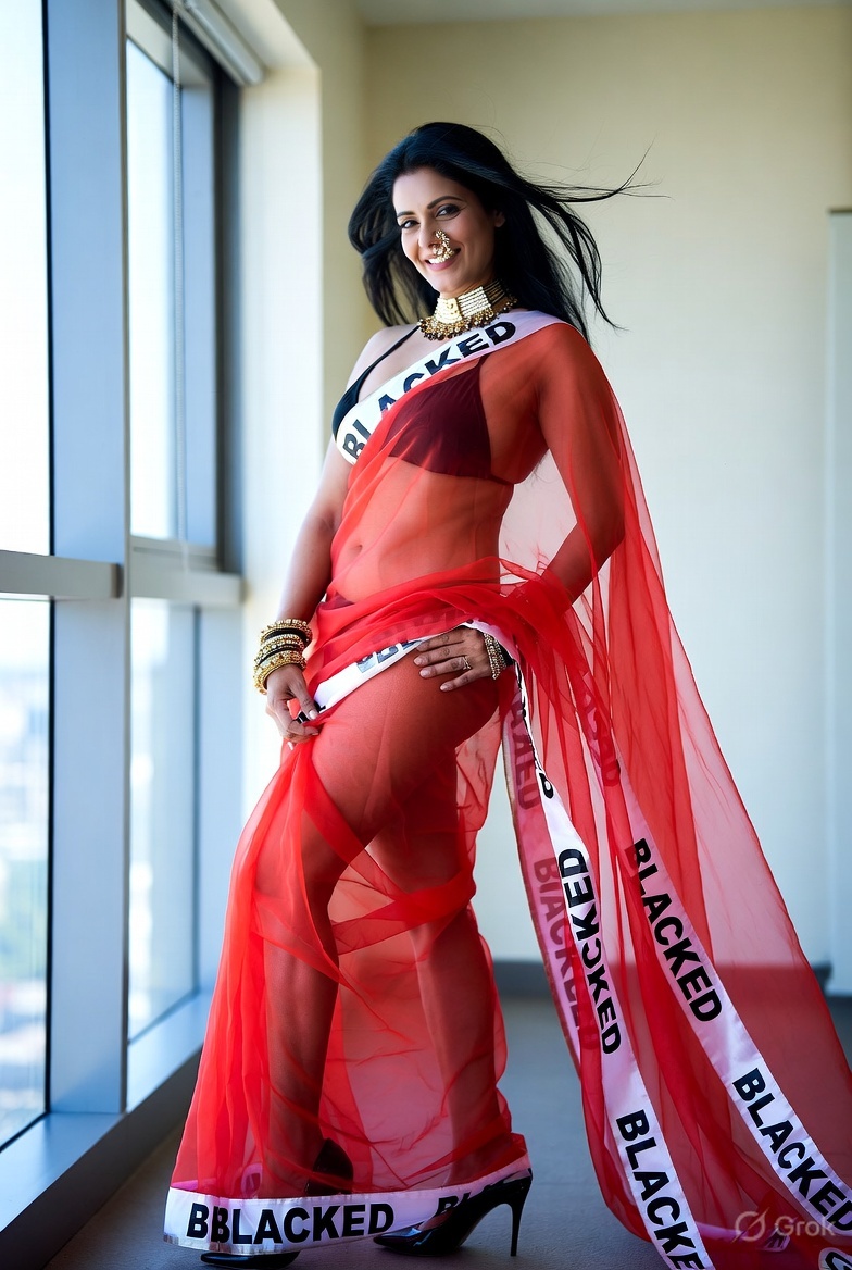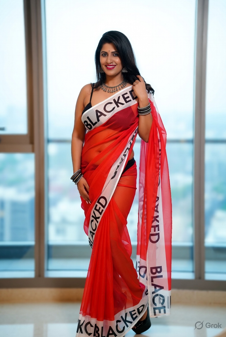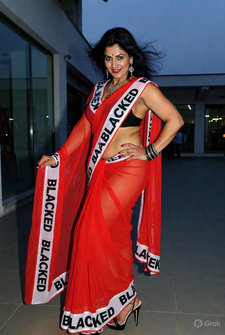>Imagine a hot Indian girl very beautiful age 42 years young wearing the iconic BLACKED saree. The saree is transparent georgette white in color and it has black borders. On the borders the word BLACKED is written repeatedly in large white font. The saree is half draped. She is wearing lace stilettos, traditional jewelry, bangles, red tube strapless latex bra and red thong latex bottoms and is smiling warmly. Her hair is shiny and flowy. She is posing in a desert at night. 36FF boob size, big cleavage, large boobs. She is posing like a boudoir model. Back view, she looks back at the camera. her legs are spread wide