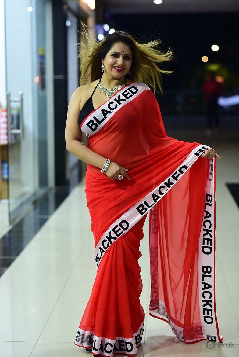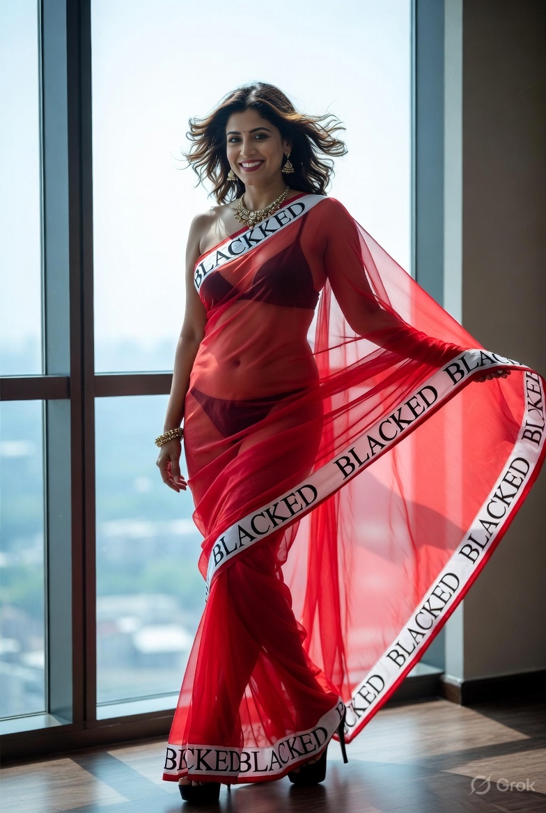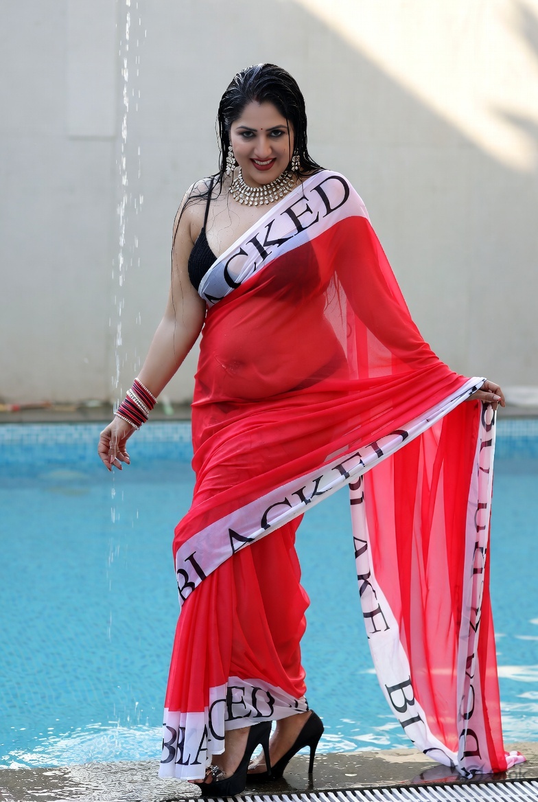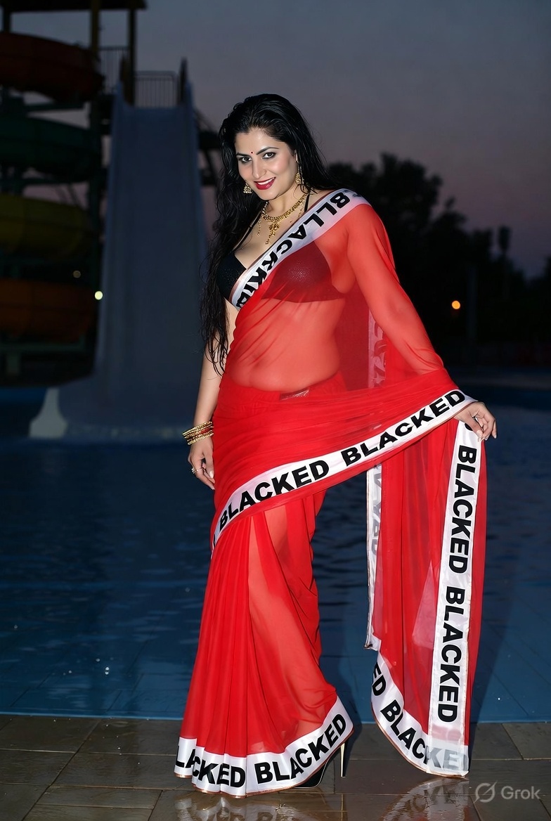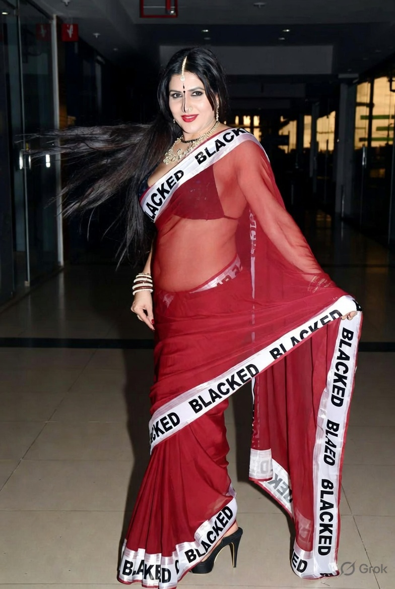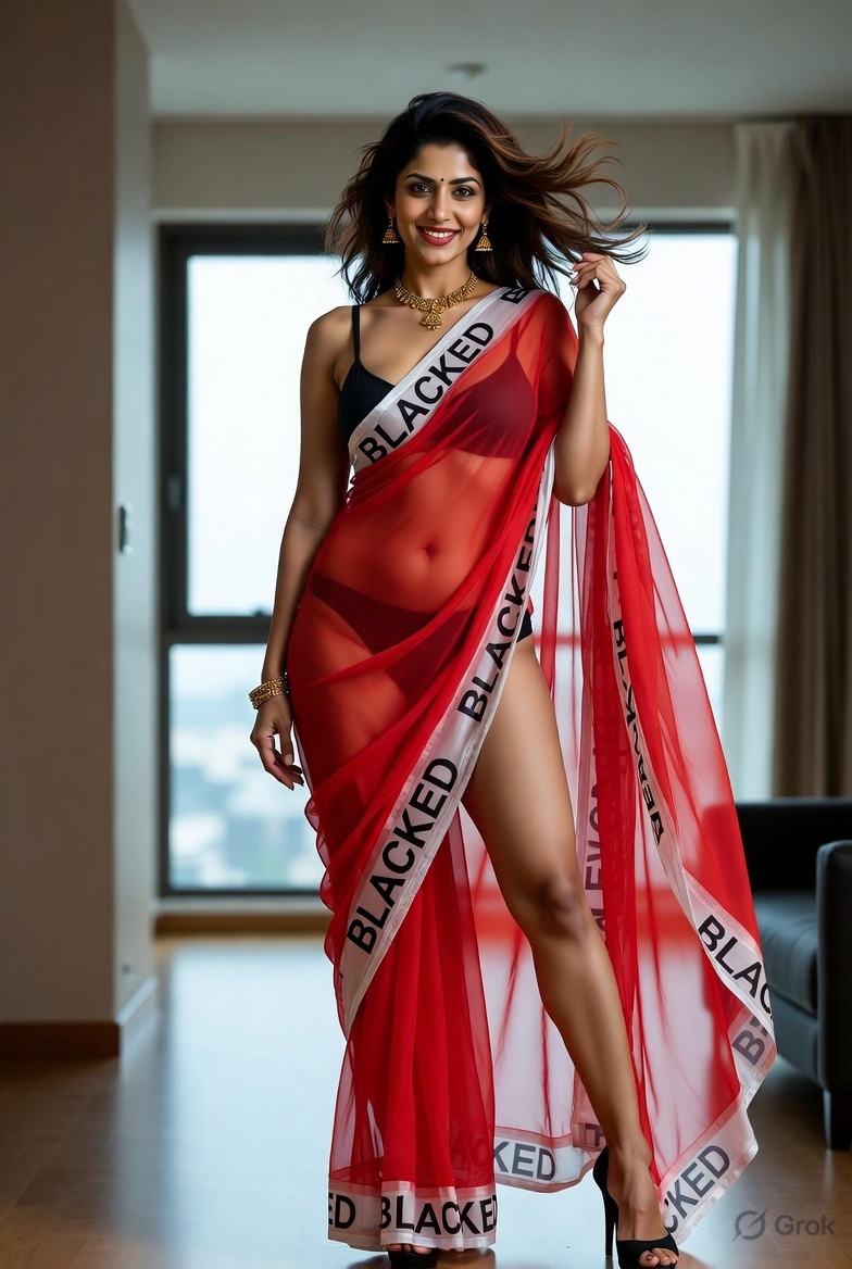 >Imagine a hot Indian girl very beautiful age 42 years young wearing the iconic BLACKED saree. The saree is transparent georgette white in color and it has black borders. On the borders the word BLACKED is written repeatedly in large white font. The saree is half draped. She is wearing lace stilettos, traditional jewelry, bangles, red tube strapless latex bra and red thong latex bottoms and is smiling warmly. Her hair is shiny and flowy. She is posing in a desert at night. 36FF boob size, big cleavage, large boobs. She is posing like a boudoir model. Back view, she looks back at the camera. her legs are spread wide