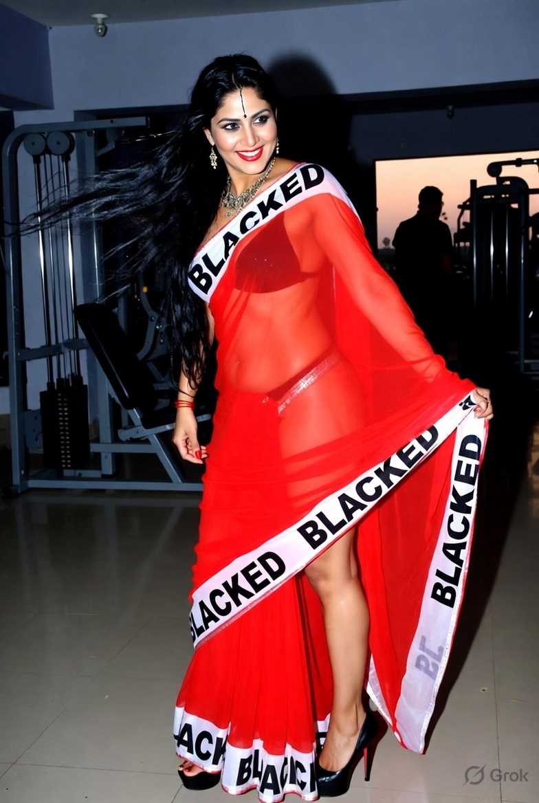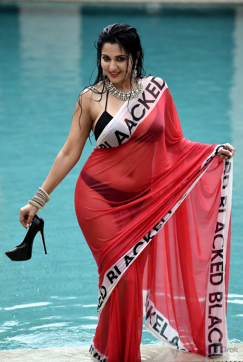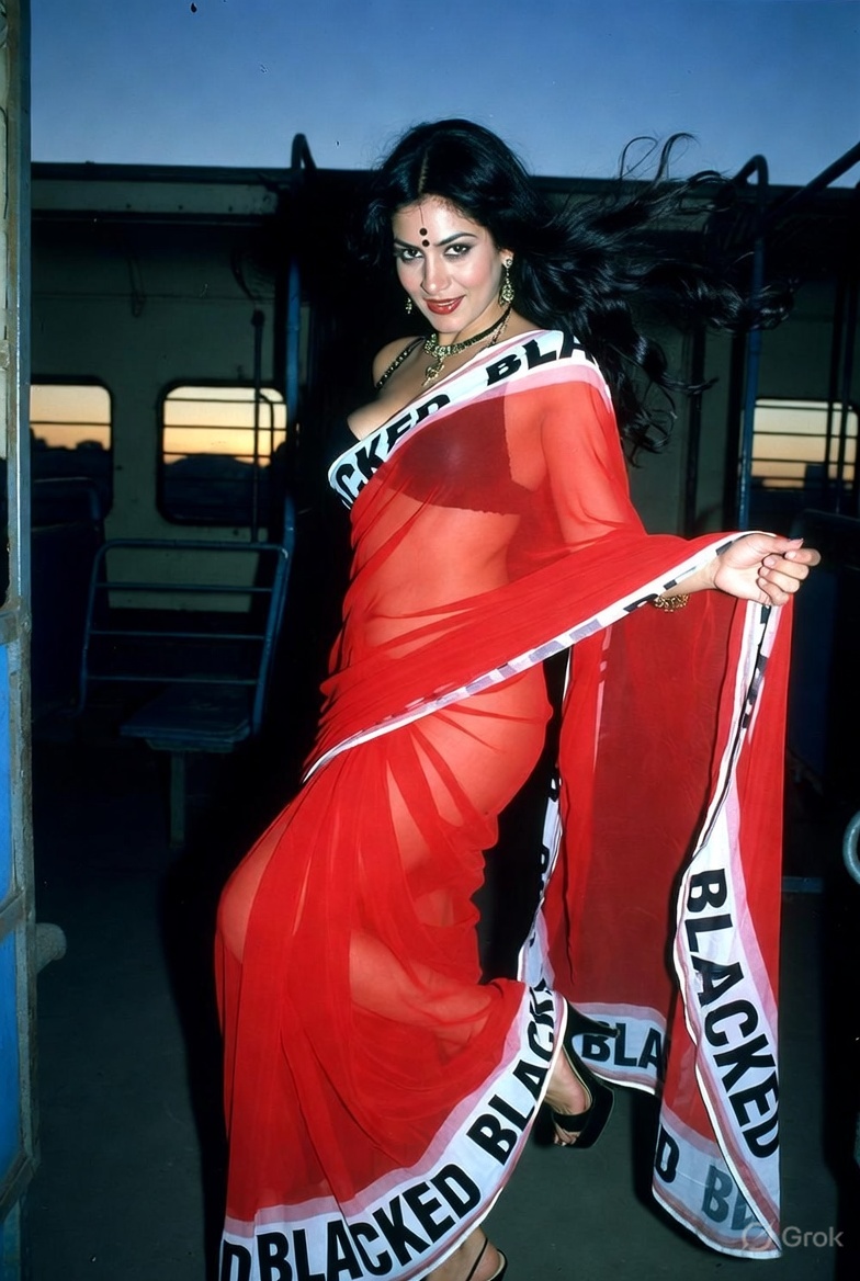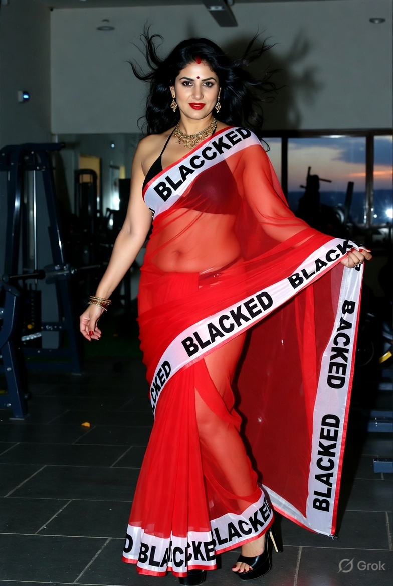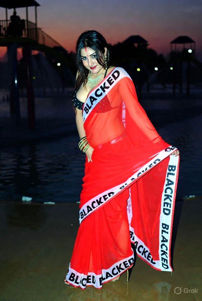 >Imagine a hot Indian girl very beautiful age 42 years young wearing the iconic BLACKED saree. The saree is transparent georgette white in color and it has black borders. On the borders the word BLACKED is written repeatedly in large white font. The saree is half draped. She is wearing lace stilettos, traditional jewelry, bangles, red tube strapless latex bra and red thong latex bottoms and is smiling warmly. Her hair is shiny and flowy. She is posing in a desert at night. 36FF boob size, big cleavage, large boobs. She is posing like a boudoir model. Back view, she looks back at the camera. her legs are spread wide
